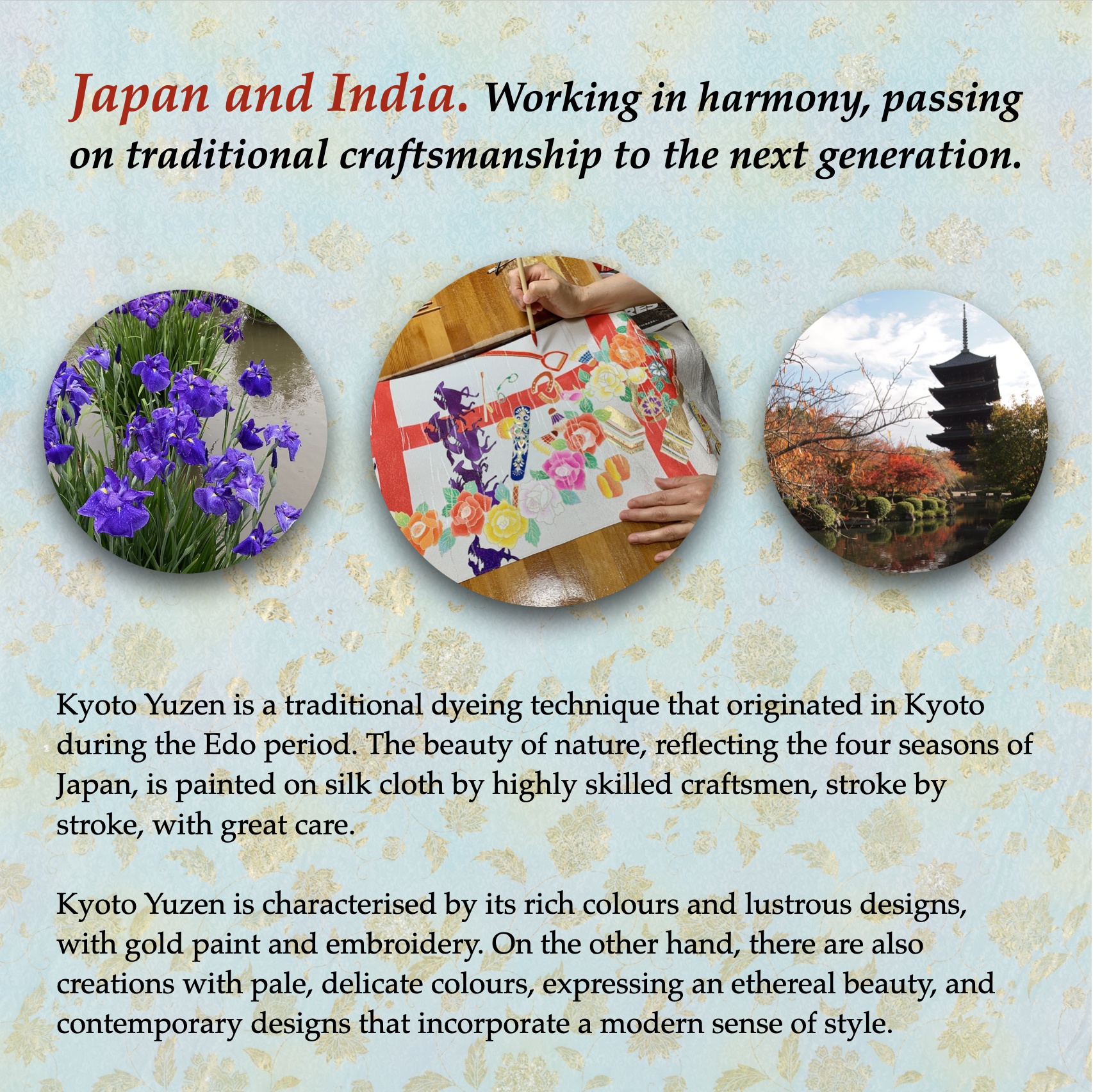 It will be a great opportunity to learn about the charms of Kyoto, the beautiful ancient capital and cultural jewel of Japan. I will also give a brief presentation on Kyoto and Kyoto Yuzen handicrafts.