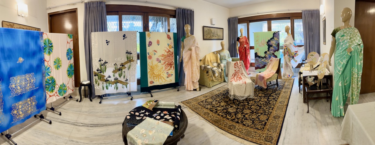 むしろ、家が地味だからこそ、サリーの美しさが引き立つ。テーブルクロスやクッションなどを購入するつもりだったが、むしろ展示会には不要だとセッティングをしたあと実感した。