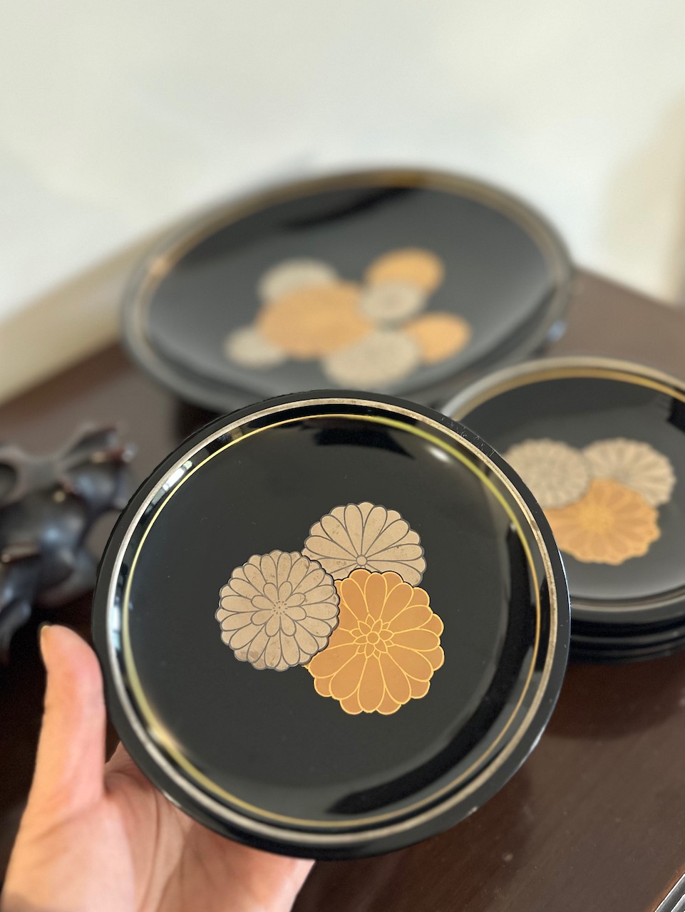 菊の御紋が上品に麗しい漆器類。