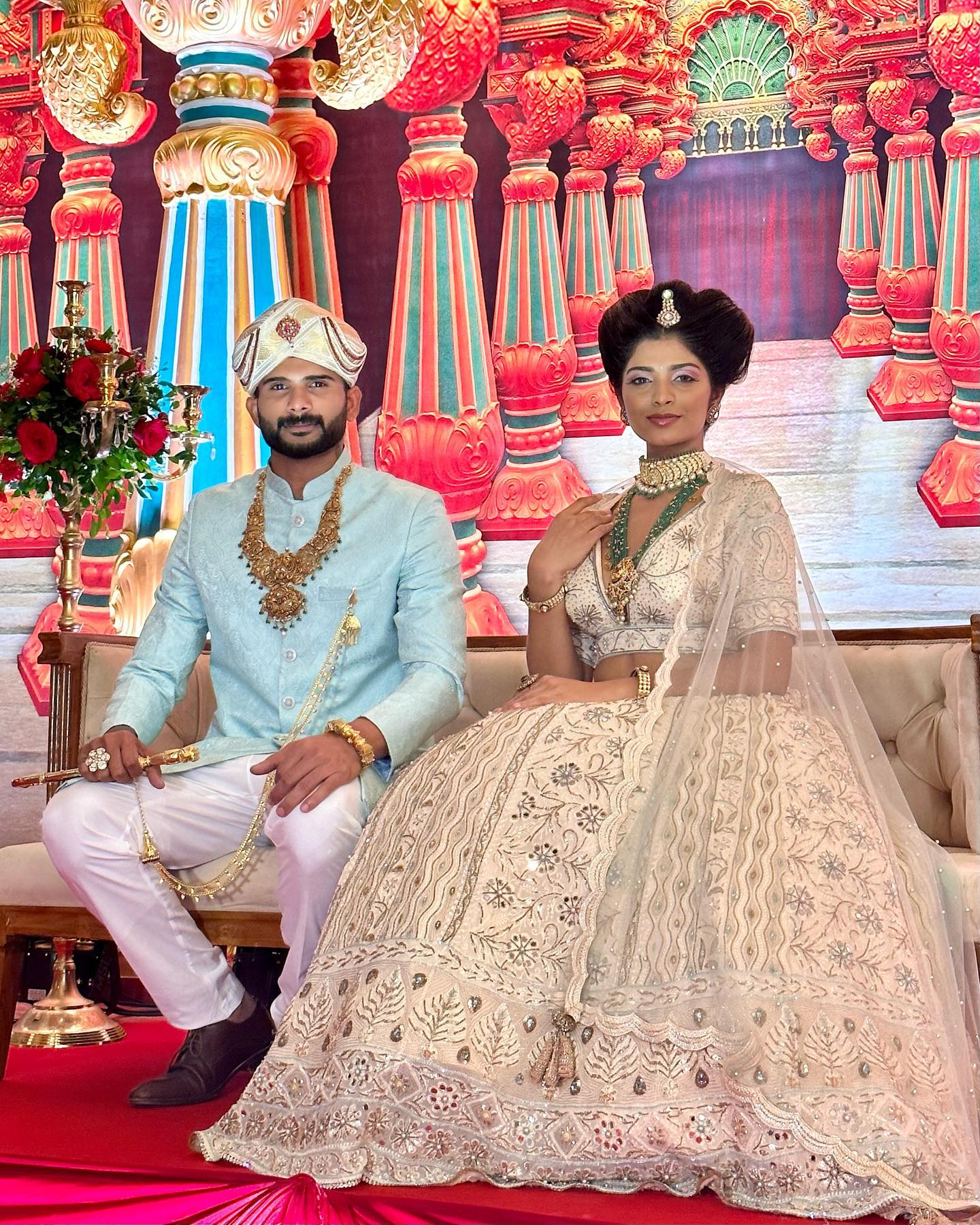会場では、同店のジュエリーを身につけた4組のカップル(モデルたち)が華やぎを添えていた。店舗で展示品を見るよりも、遥かに臨場感がある。結婚式の新郎新婦を演じる彼ら。ちなみに南インドの結婚式では、石よりも「金(ゴールド)」が目立つ。ネックレスだけでなく、チャンピオン・ベルトのような金ベルトも特徴的だ。
