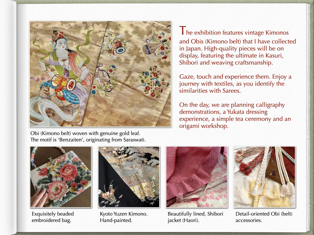 日本から持ち帰った着物や羽織、帯などと共に、同じ技法で創られたサリーを並べて展示する。日本とインド、両国の「縁」を視覚的に捉えてもらうために。今回は、自宅での小規模な催しだが、将来、積極的に続ける予定だ。
