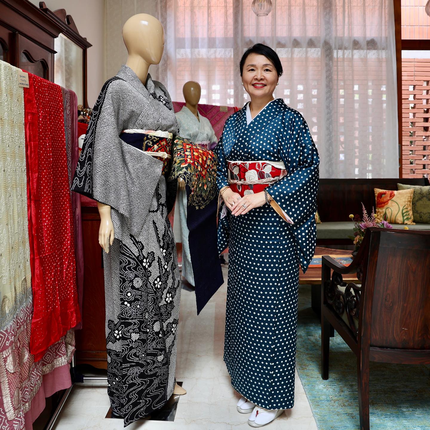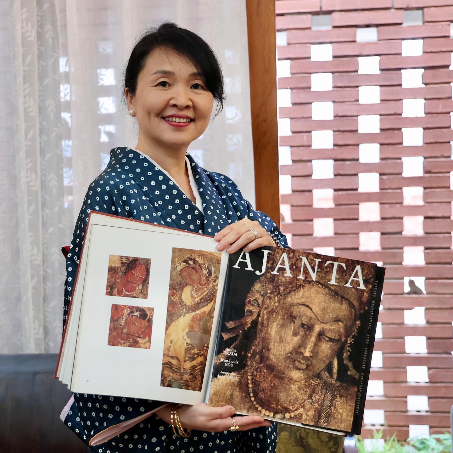 The exhibition was held at my house the other day. On the second day, I wore my mother’s kimono, which was purchased about 50 years ago. It is pure silk and indigo-dyed Shibori (tie-dye). The pattern is very similar to the dancer’s top on the mural in Ajanta.