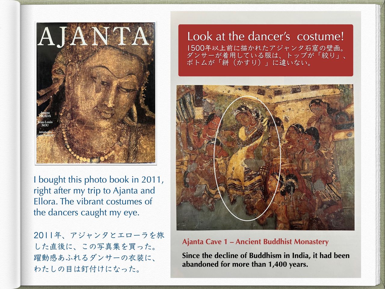 このダンサーは、トップが絞り、ボトムが絣(かすり)の衣装に身を包んでいる。2011年前にアジャンタとエローラを旅した後、この写真集を購入。躍動感あふれる彼女の衣装に、わたしの目は釘付けになったものだ。