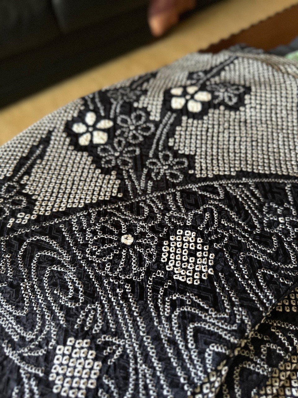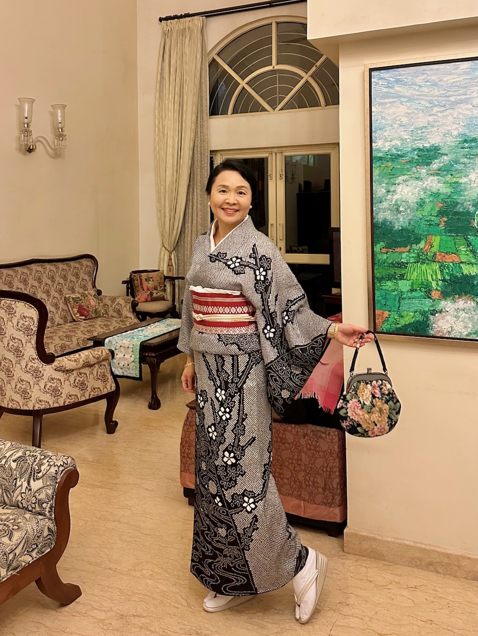 着物は、先日の一時帰国時に福岡市天神の「新天町」という繁華街の呉服店で購入した中古。しかしながら、目立つ汚れやシミはない。正絹、総絞りの華やかな着物だ。帯や帯紐、帯揚げなどは、50年ほど「箪笥の肥やし」になっていた母のもの。