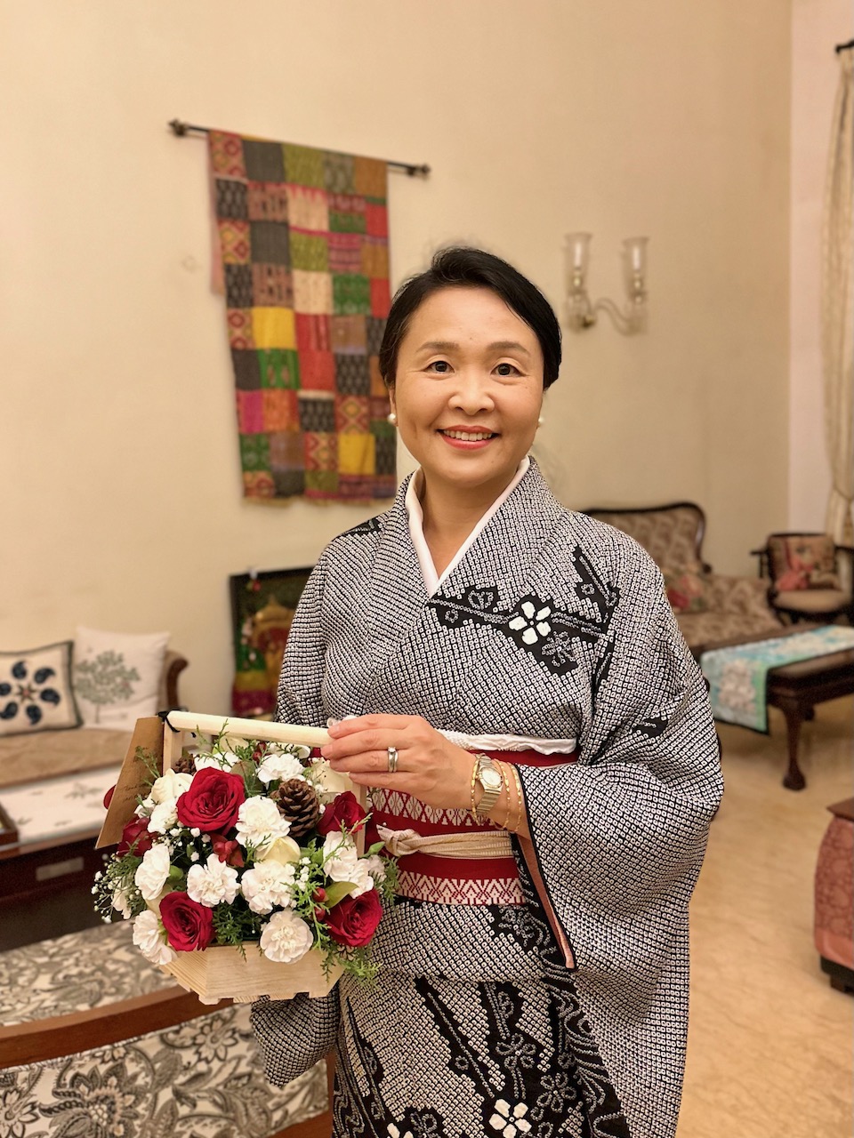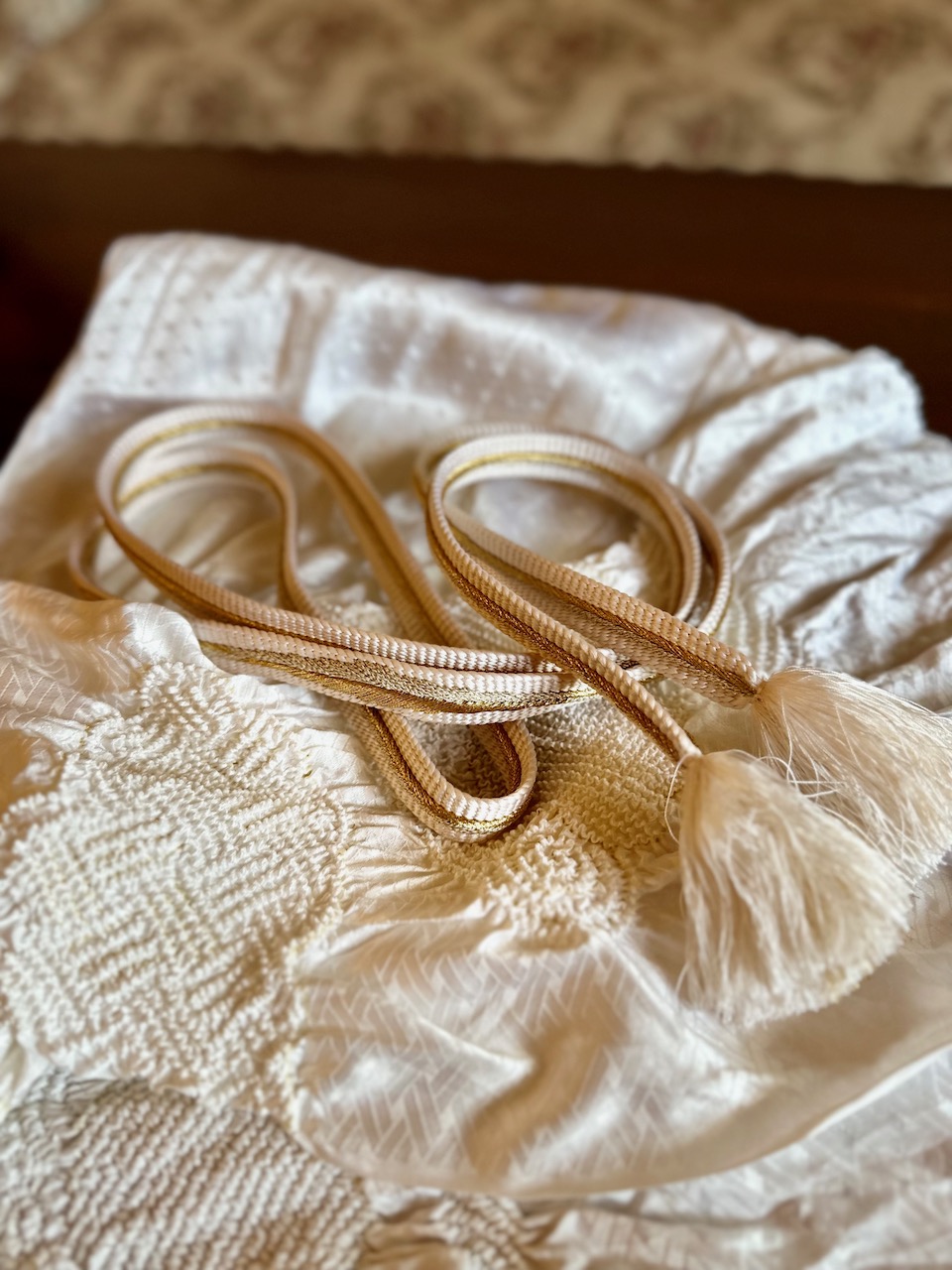 帯揚げは、やはり半世紀、未使用のまま化粧箱に入っていた正絹の絞り。帯締めもやはり未使用の麗しいもの。光沢艶やかな白に金が施されたそれらは、本来は礼装、正装向けらしい。しかし、ここはインド。クリスマス風のコーディネーションとして赤い帯に合わせた。正統ではない着方だろうけれど、合わせるのが楽しい。