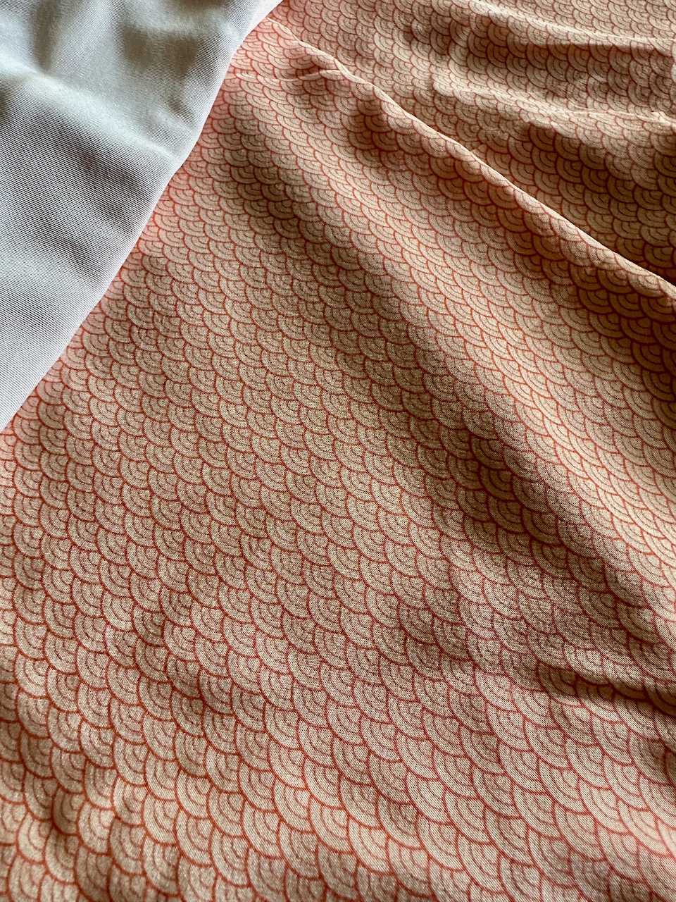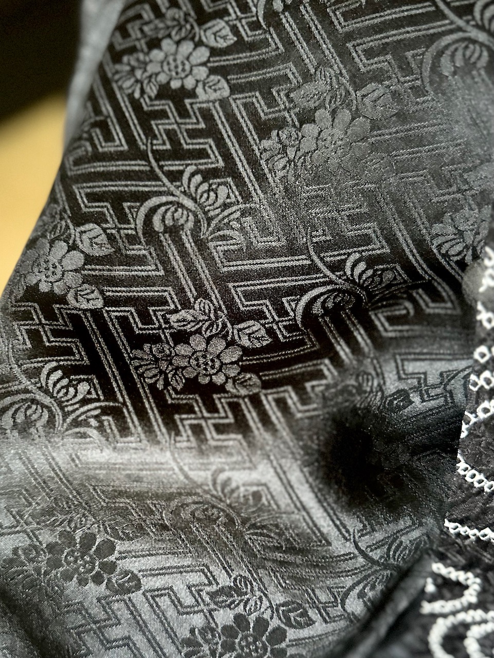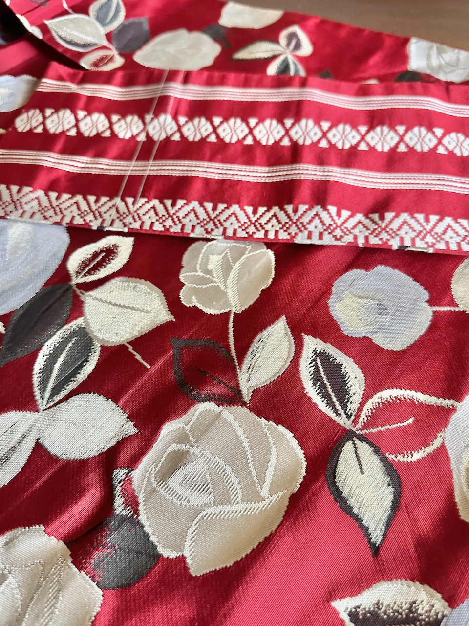 博多織であろう帯は、薔薇の花(多分)がモダンな美しさ。先日は前の部分も薔薇を見せたが、昨日は裏返して博多織独特の幾何学的な柄が見えるようにした。調べてみると、博多織は800年近い歴史がある。