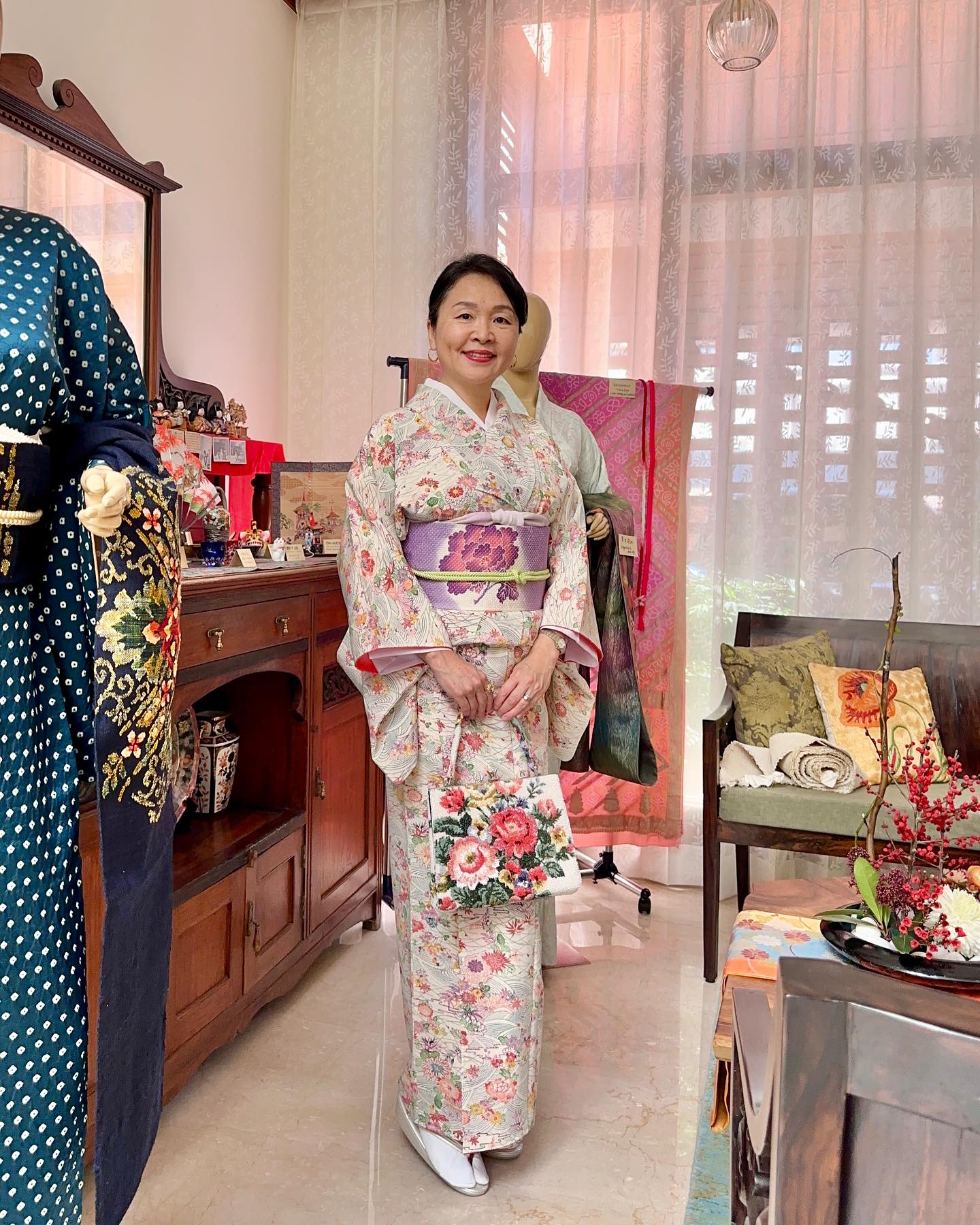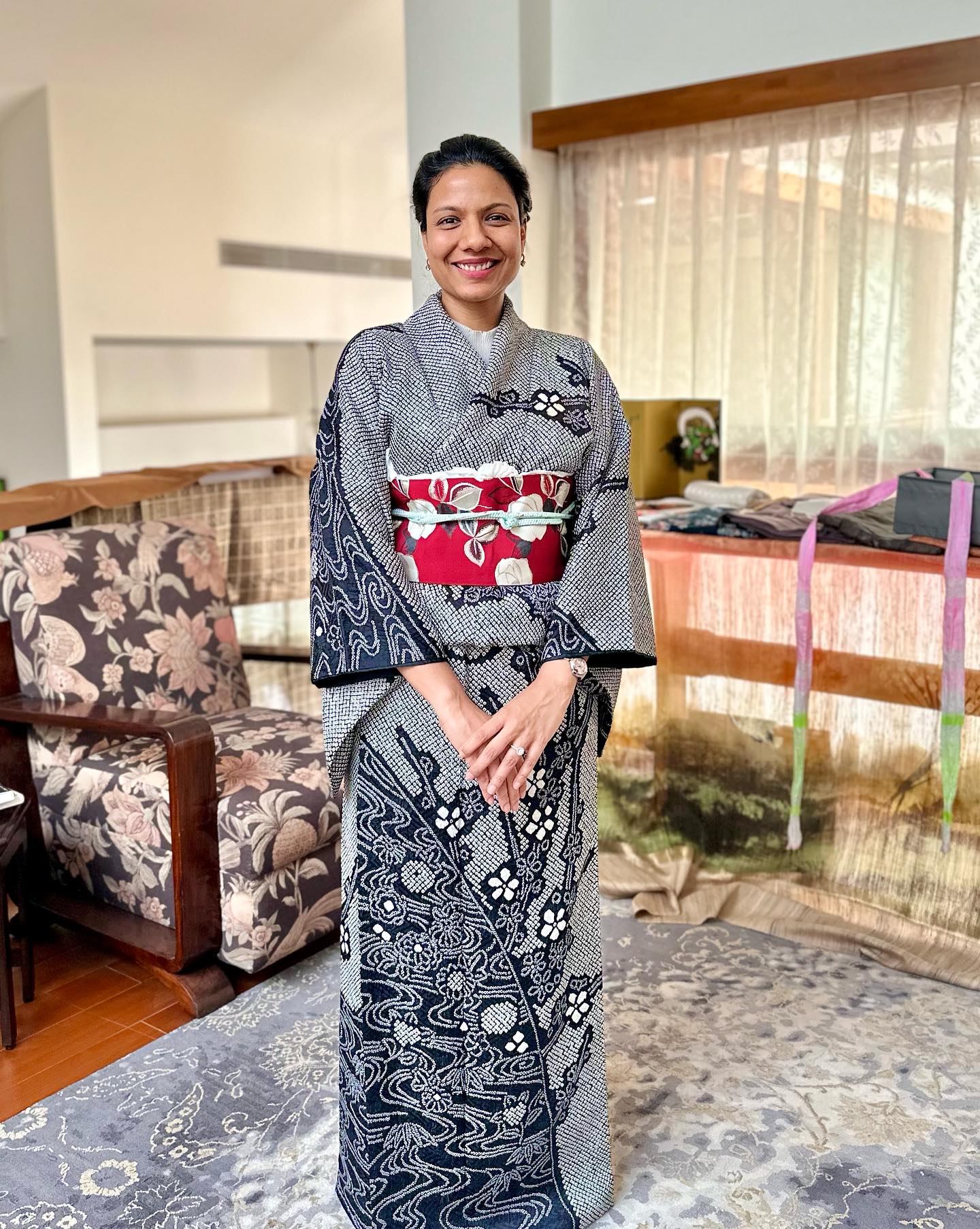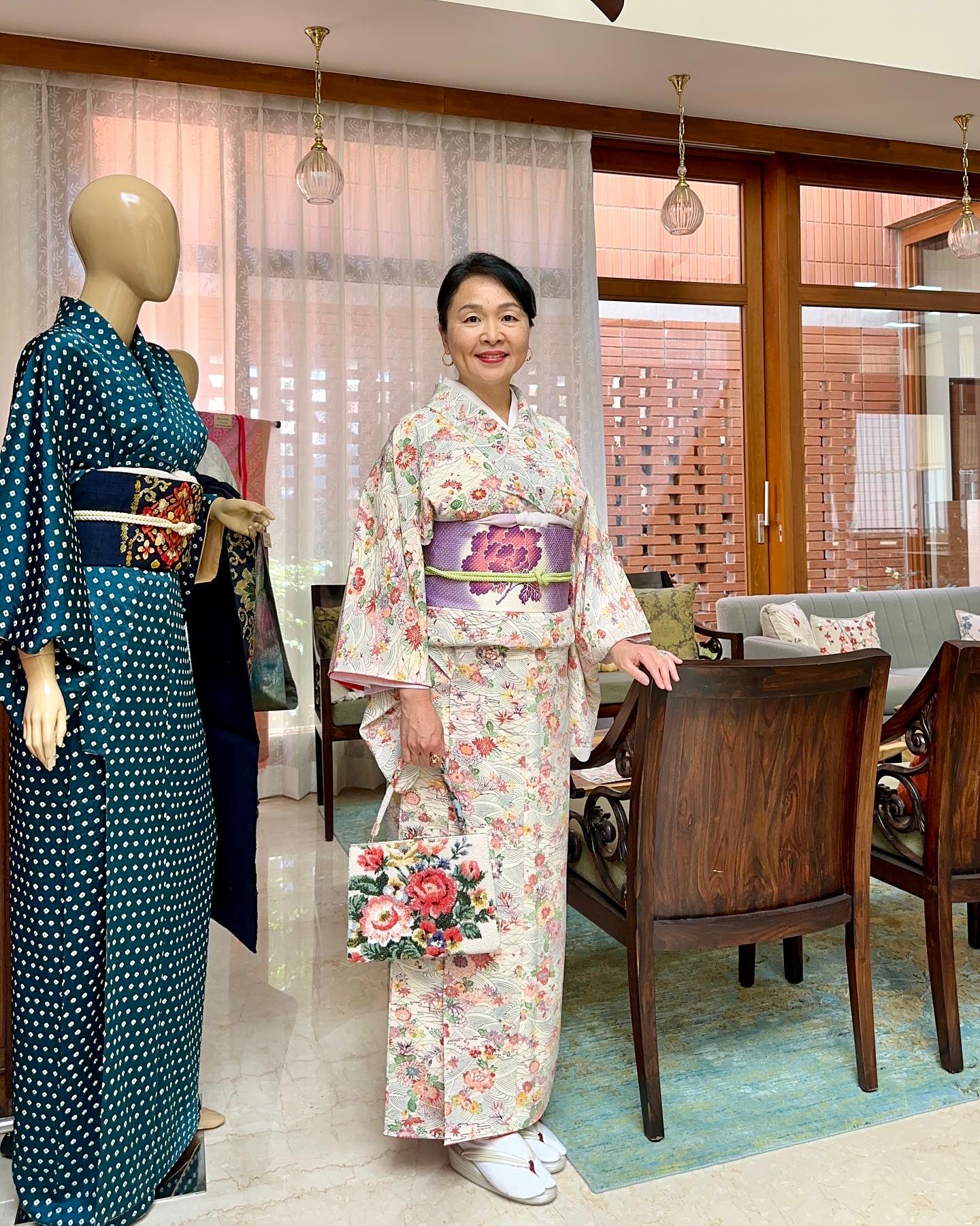 特に打ち合わせをしたわけでもないのに、花とテキスタイルの彩りが調和していたのも、本当によかった。Meghaaには、雑な着付けながらも、着物の試着をしてもらった。洋服のときとは、ガラリと印象がかわって、着物もよくお似合いだ。