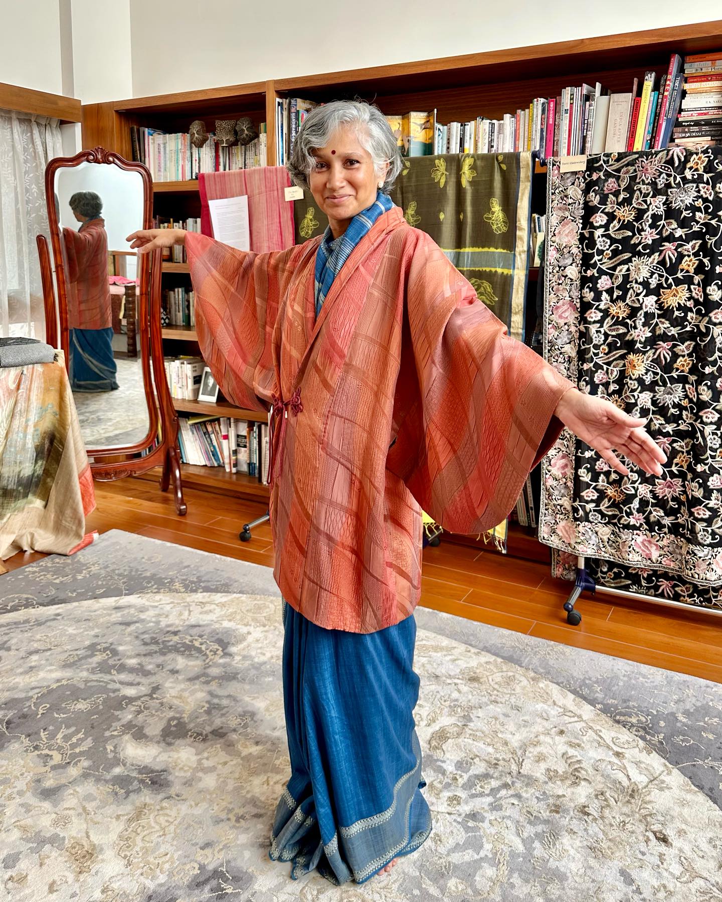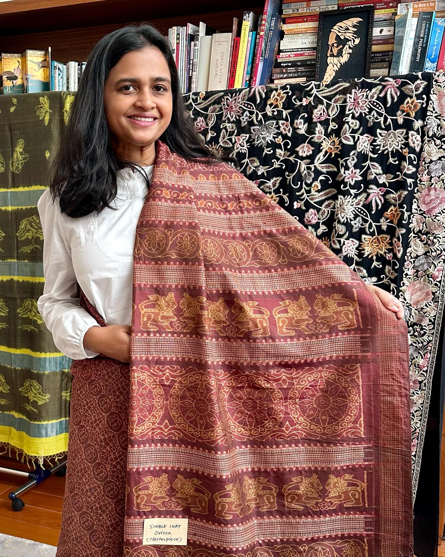 ともあれ、そのような事件があった直後だけに、本当に取材力と文章力のあるジャーナリストに記事を書いてもらえたことは、うれしかった。彼女とは、共通の関心も多く、話も弾んだ。なお、彼女はオリッサ州出身とのことで、わたしの大好きなオリッサのイカット(絣)を見せて羽織ってもらった。これは、かつてDASTKARのバザールで購入した、オリッサの職人の傑作なのだ。