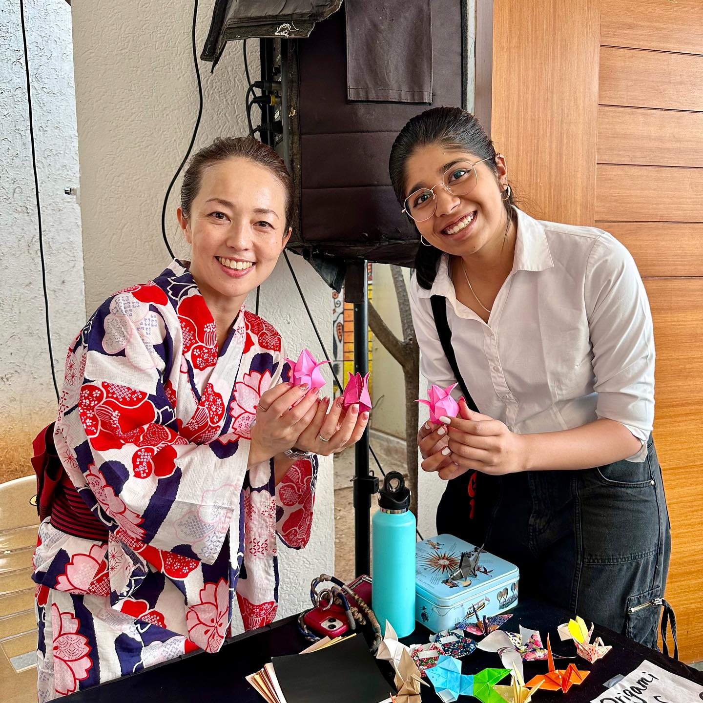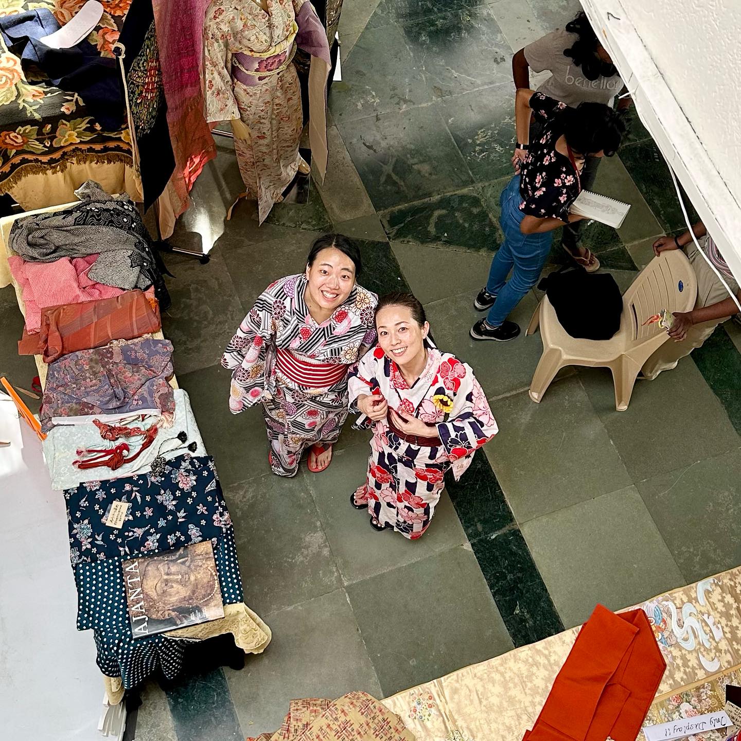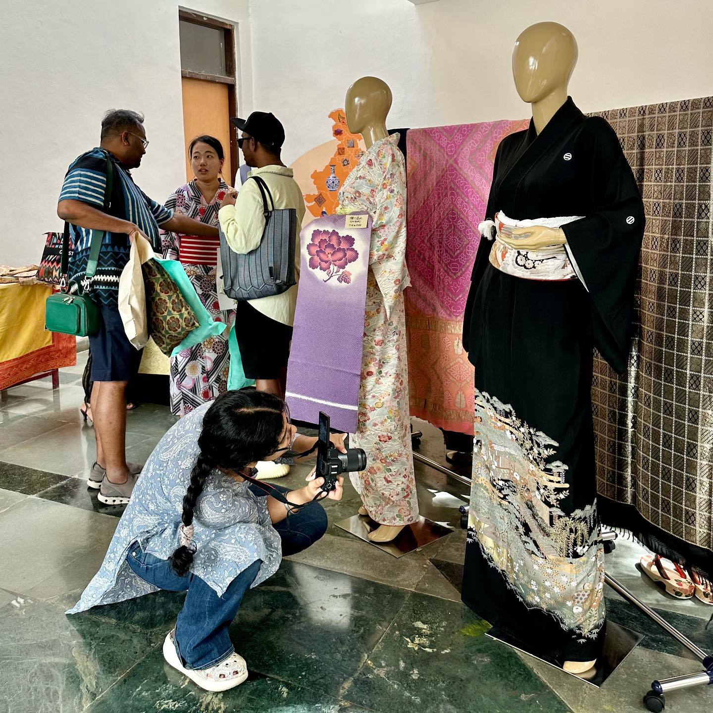 せっかくの機会。他の日本の方々にも協力してほしい。ミューズ・クリエイションのWhatsAppコミュニティにて有志を募ったところ、1日目に5名、2日目に2名が参加可能ということだったので、書道や折り紙のデモンストレーションも実施することにした。着物を展示する都合上、外のテントではなく、できれば建物内で……とお願いしたのが幸いした。Mala の計らいにより、広めのスペースを提供していただけたので、マネキン・ガールズ2名、およびポールなども準備する。テキスタイルの展示は「立体的」な方が人目をひくがゆえ。