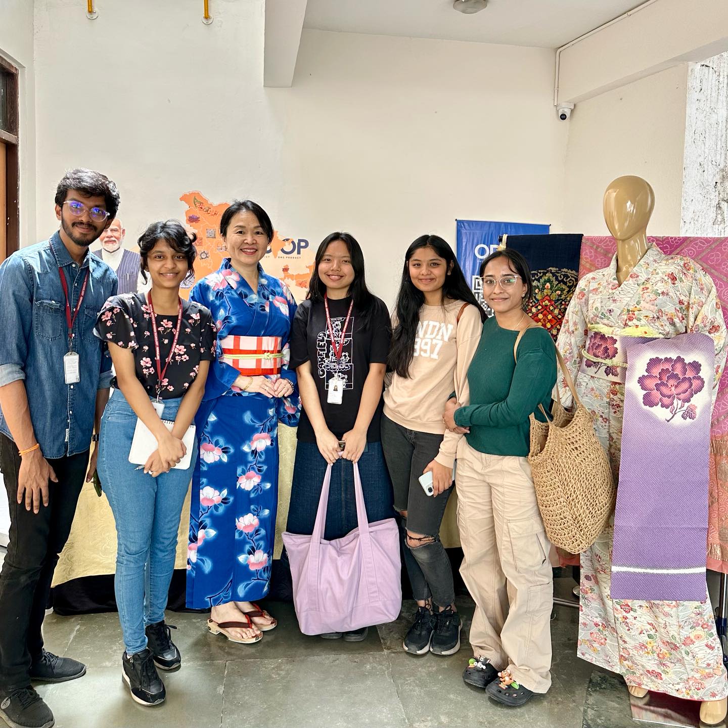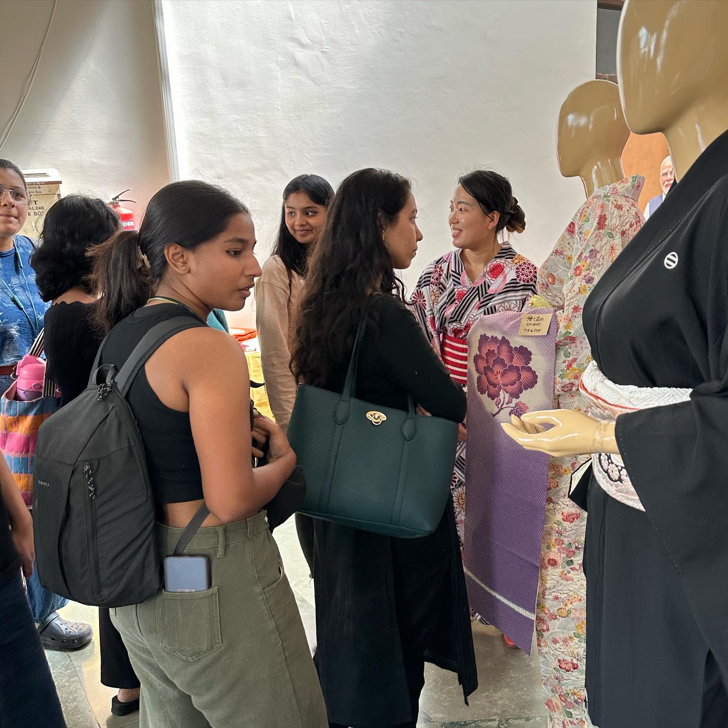2日目は、ファッションを学ぶNIFTの学生たちが次々に来訪。興味津々に着物を眺め、質問をしてくる。彼らの母親世代が、すでに「サリー離れ」が進んでいることもあり、インドの伝統的なテキスタイルに触れ合う機会が少ないようだ。聞けば学校で、伝統的なテキスタイルのことも積極的に勉強しているという。学生グループに、インド起源のテキスタイルが日本の衣類に及ぼした影響についてなど、着物を見せながら語ることを繰り返す。