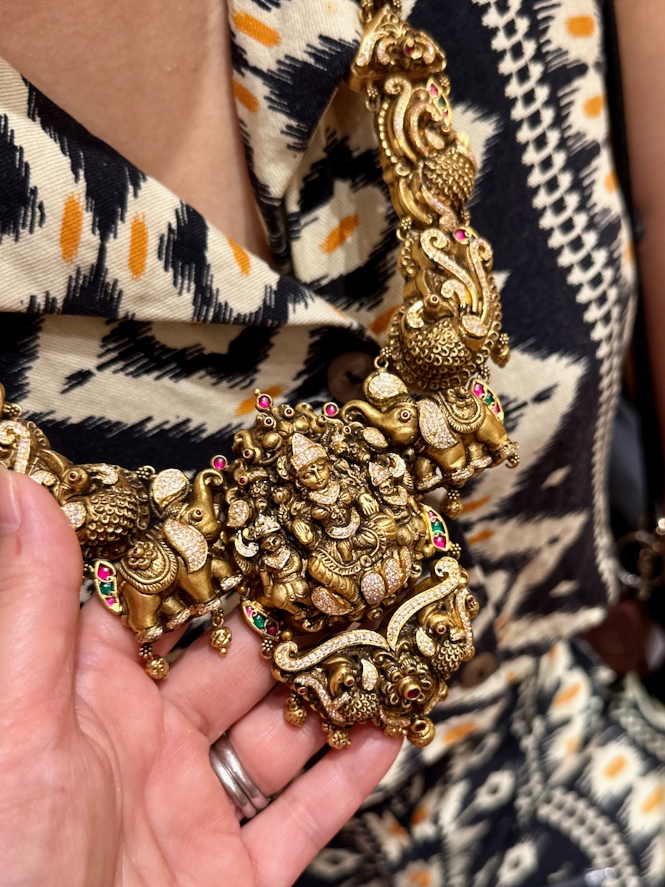 美しい金(ゴールド)のネックレスとピアスを試着させてもらった。それはわたしにとって、とても心躍る体験で、1日たった今も強く印象に残っている。インドの結婚式では、新郎新婦が豪華な装飾品を身に着けることは知っていた。『マダム・イン・ニューヨーク』というボリウッド映画を見て以来、いつかインドのネックレスを着けてみたいと思っていた願いが叶った瞬間だった。想像していたよりも重く、これが「金」なんだと思った。インドのネックレスは、22金で作られたものが主流で、それに、プレシャスストーンが施される。日本語で「貴石」と呼ばれるもので、エメラルド、ルビー、ダイヤモンド、サファイヤの4種類だとのこと。