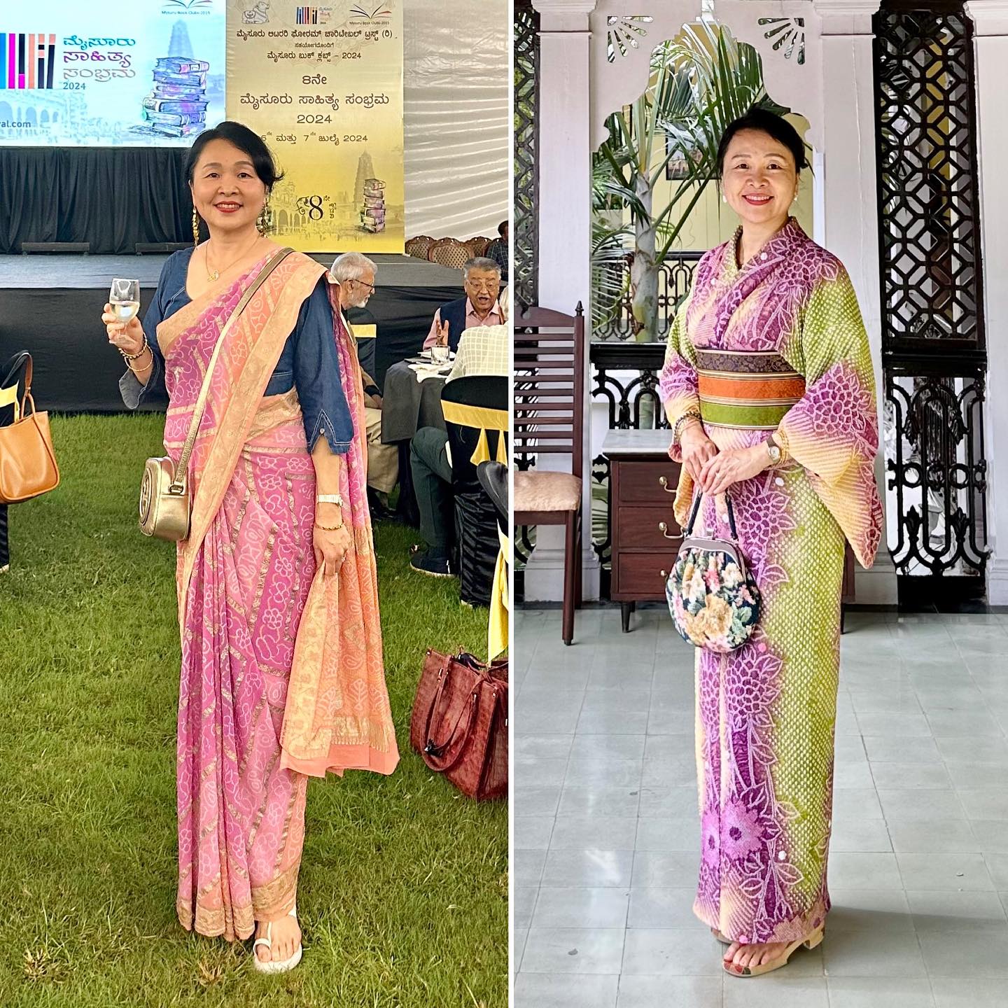 When I recently attended the Mysure Literature Festival, I wore an Indian bandhani (tie-dyed) saree on the first day and a Japanese Arimatsu Shibori yukata on the second day.