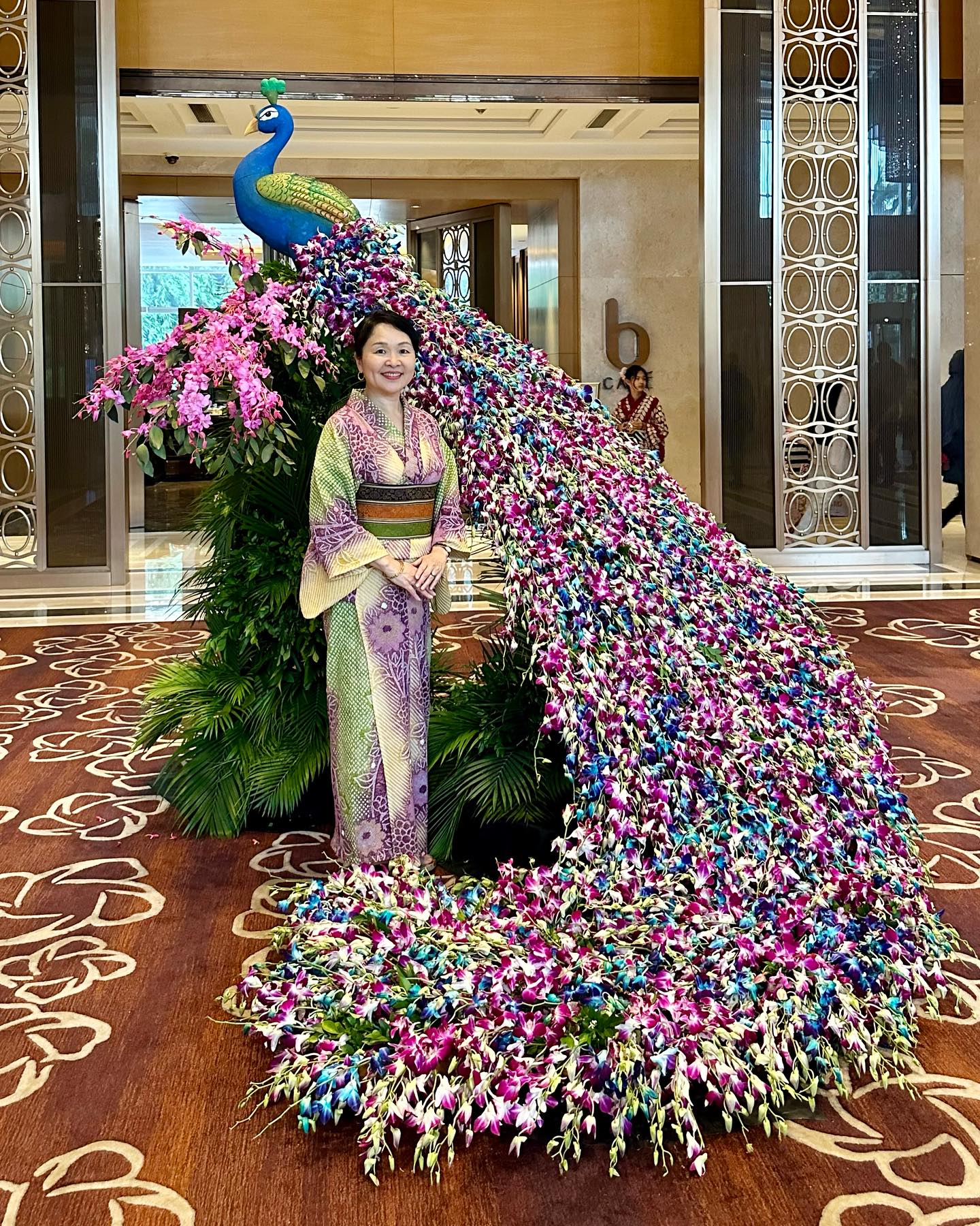 ところでシャングリ・ラ・ホテルに来るたびに、ロビーのフラワーアレンジメントの前で写真撮影をするのが恒例なのだが、今回は、笑えるほどダイナミックだった。多分、独立記念日に因んでの国鳥クジャクの登場なのかもしれない。もはや、アミューズメントパーク状態だ。