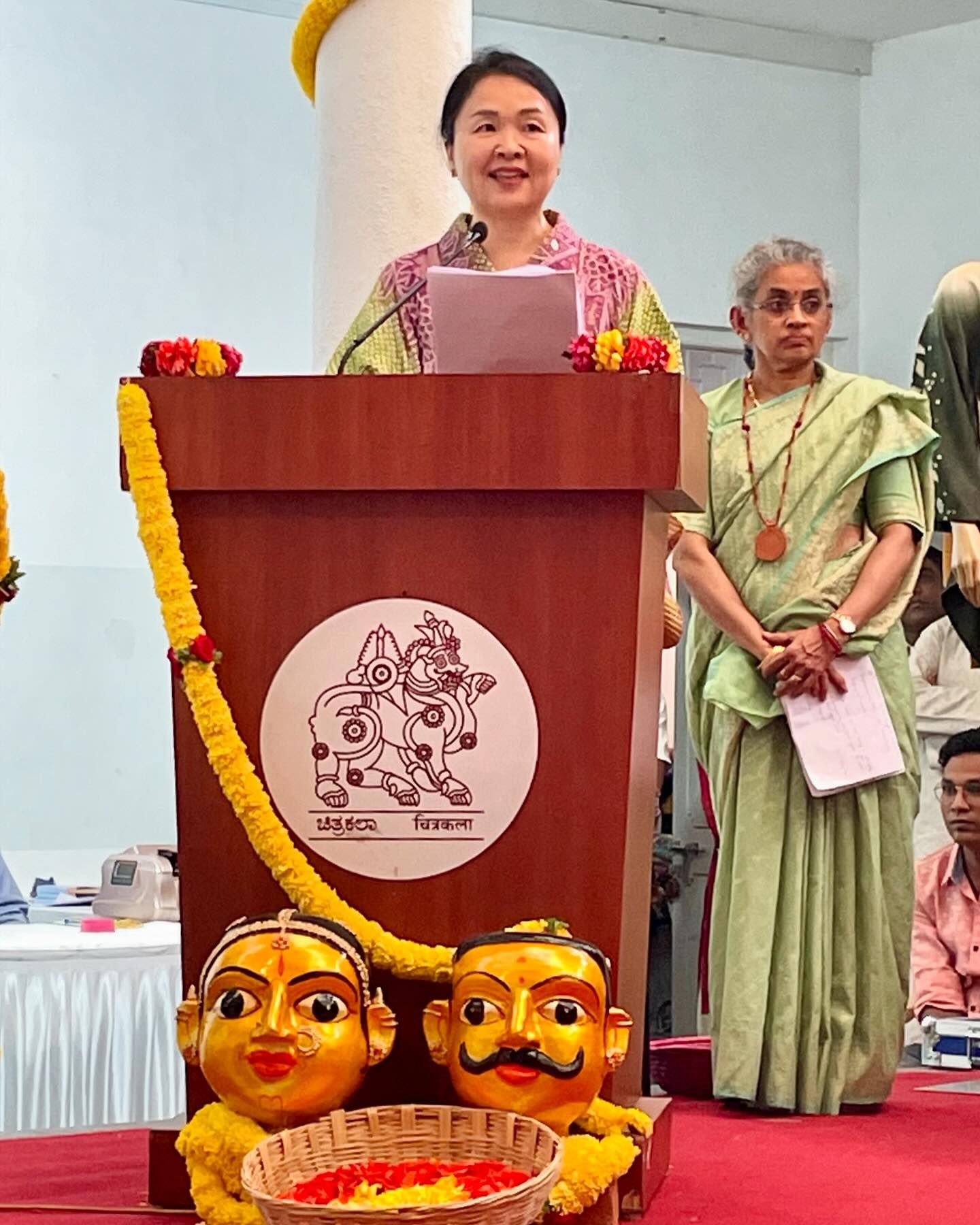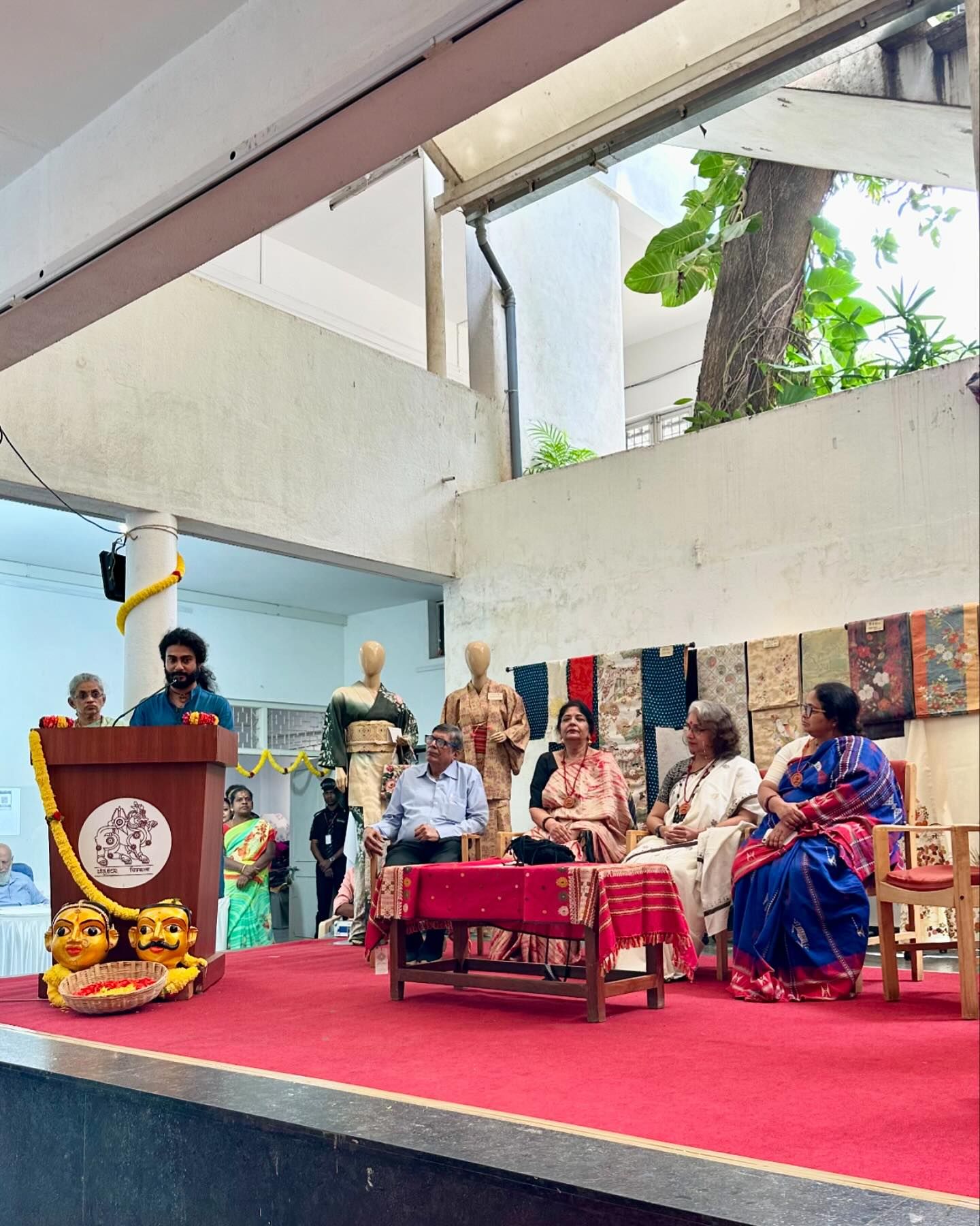 開会式の主賓は、南インド映画の女優/監督はじめ、多彩な肩書きと数々の受賞歴を持つRevathi。白いサリーを着用されている女性だ。この催しの主催団体であるカルナータカカルナータカ工芸評議会の役員ら、そしてRevathiのスピーチのあと、わたしのトークで開会式が締め括られた。