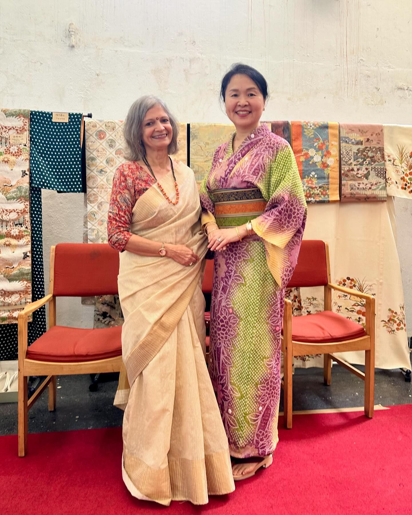 The two suitcases were truly treasure chests! Kimonos and obis created with advanced techniques, such as Shibori, Kasuri, and Kyoto-Yuzen, were crammed into the suitcases! Most of them had been kept for half a century, had never been worn, and were in pristine condition. After sending my mother’s kimonos to India, I continued my travels in Japan. In Nagoya, I visited Arimatsu, the home of Shibori. In Tokyo, I visited kimono stores and exhibitions. I learned a lot through conversations with people involved in the kimono industry.