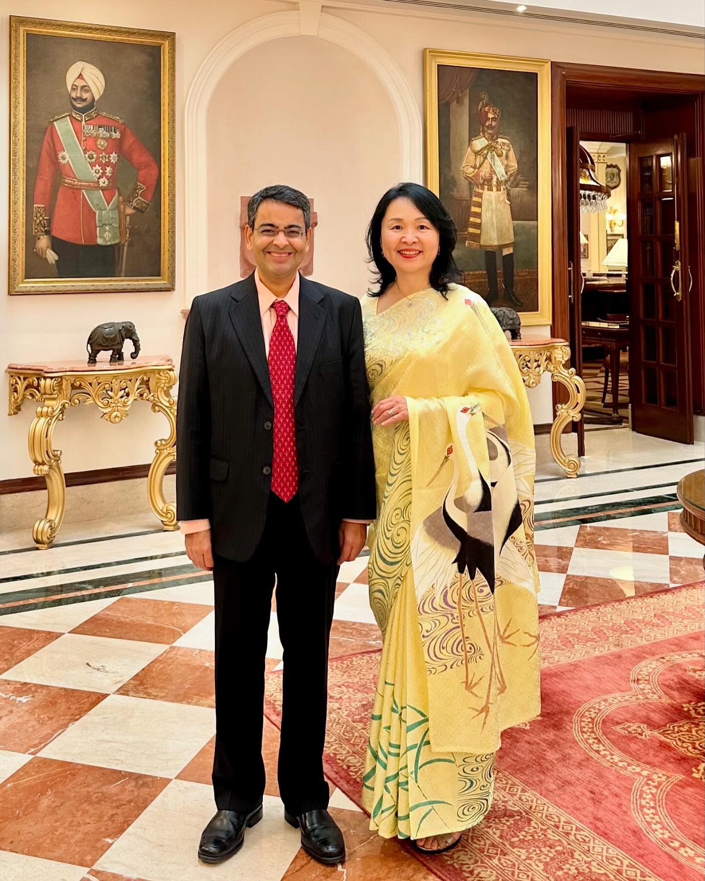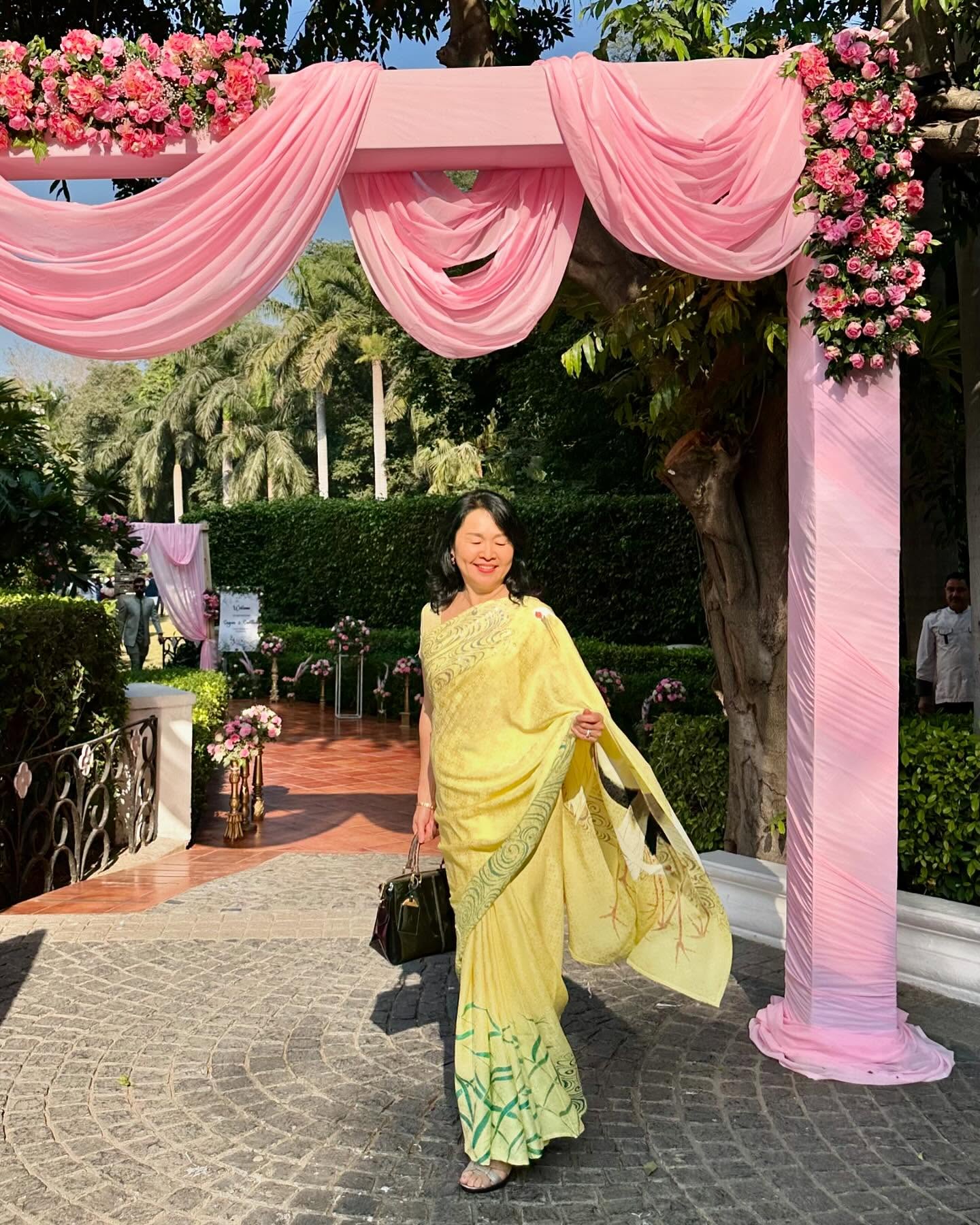 2日目も、京友禅サリーを着用した。レモンイエローのやさしい色調。ブラウスは、手持ちのパールシー刺繍のサリーのブラウスを合わせた。色合いがほとんど同じで調和している。