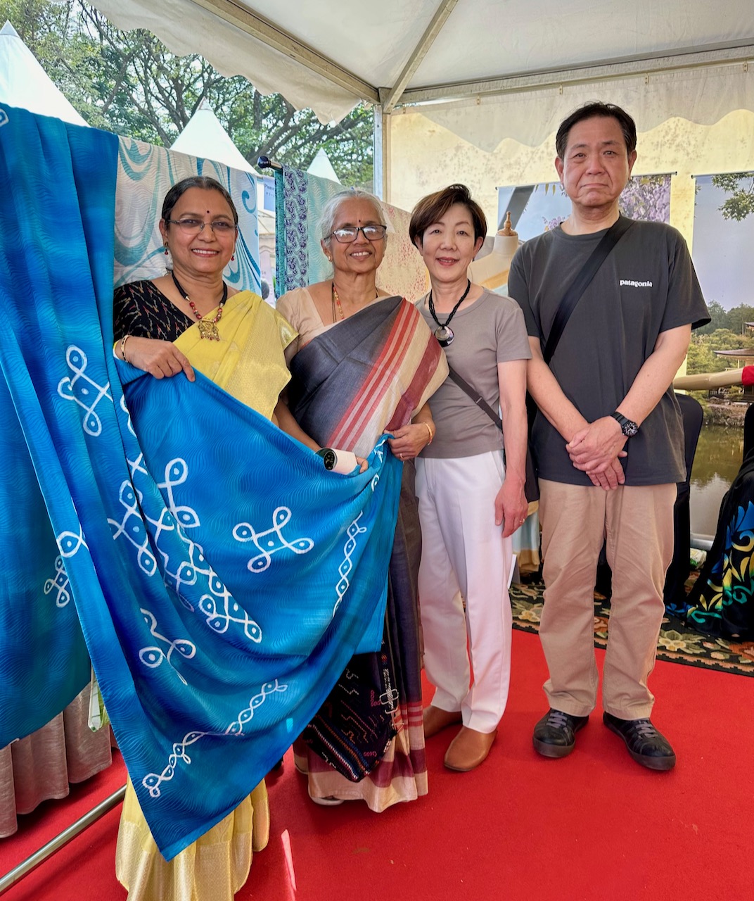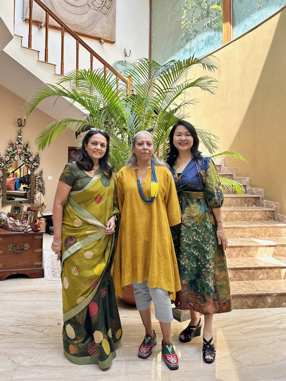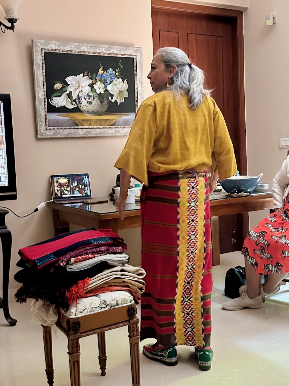 今回の展示会では、友人YashoのサリーブランドMrinaliniの、高品質なサリーも展示販売している。夕方、Yashoのお母様と娘のMrinaliniも来訪。サリーや着物を眺めたあと、彼女もまた、ライブラリのテーブルに散らかったままの本や手書きのノートを見て、強い関心を示す。