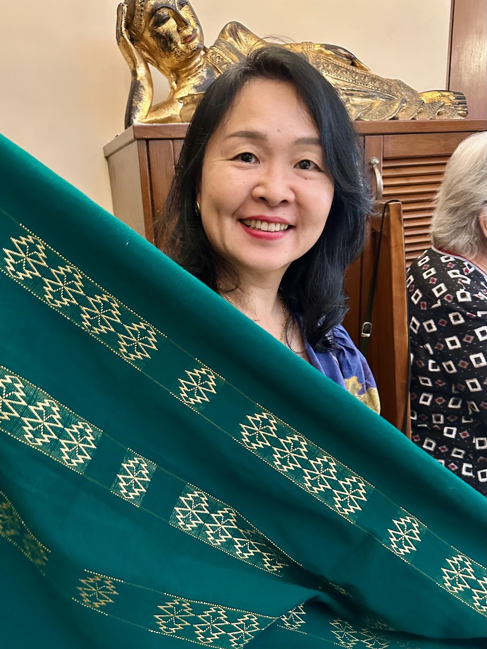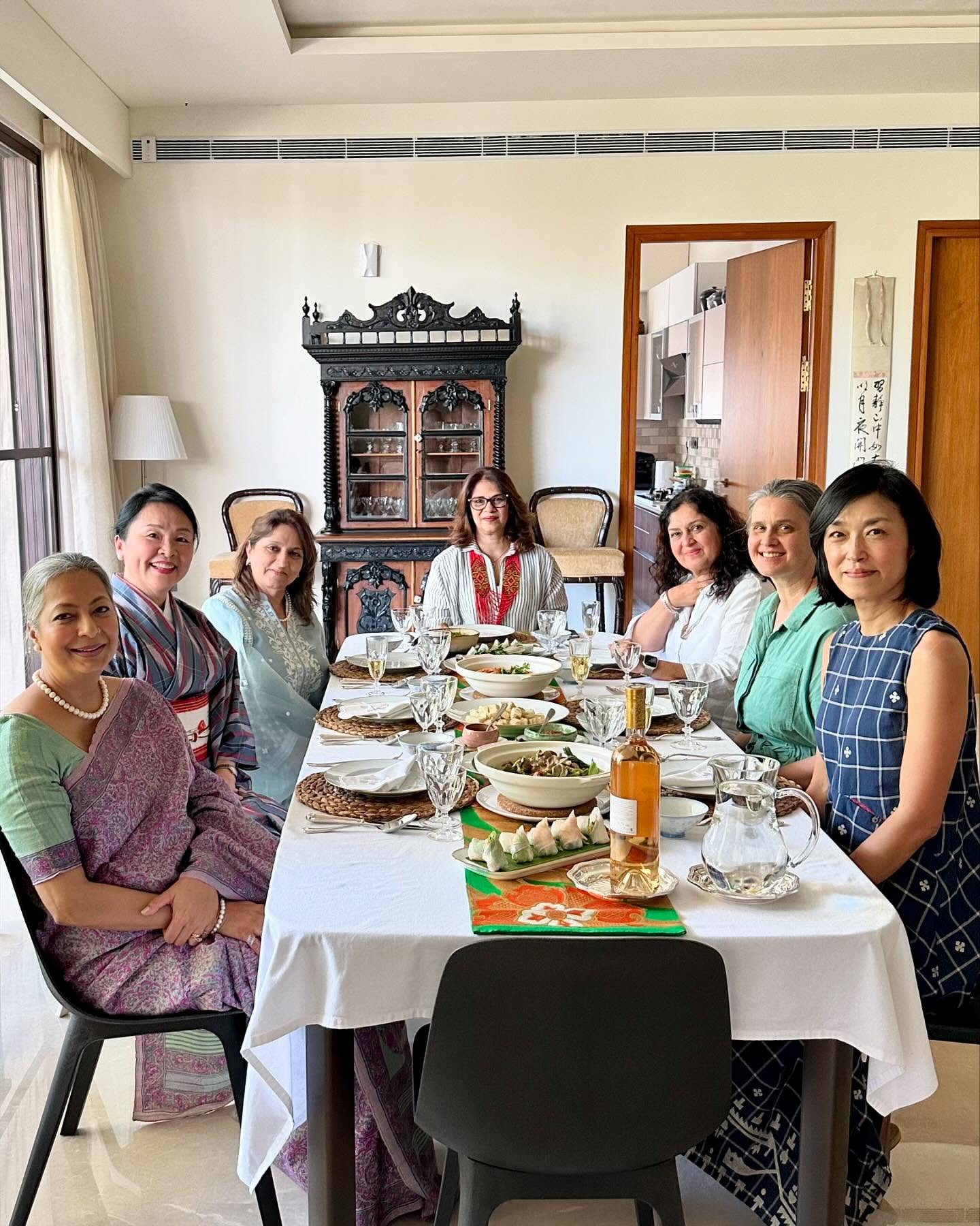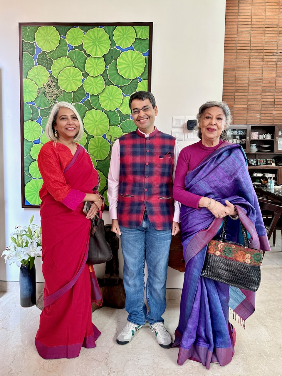 今回の展示会では、友人YashoのサリーブランドMrinaliniの、高品質なサリーも展示販売している。夕方、Yashoのお母様と娘のMrinaliniも来訪。サリーや着物を眺めたあと、彼女もまた、ライブラリのテーブルに散らかったままの本や手書きのノートを見て、強い関心を示す。