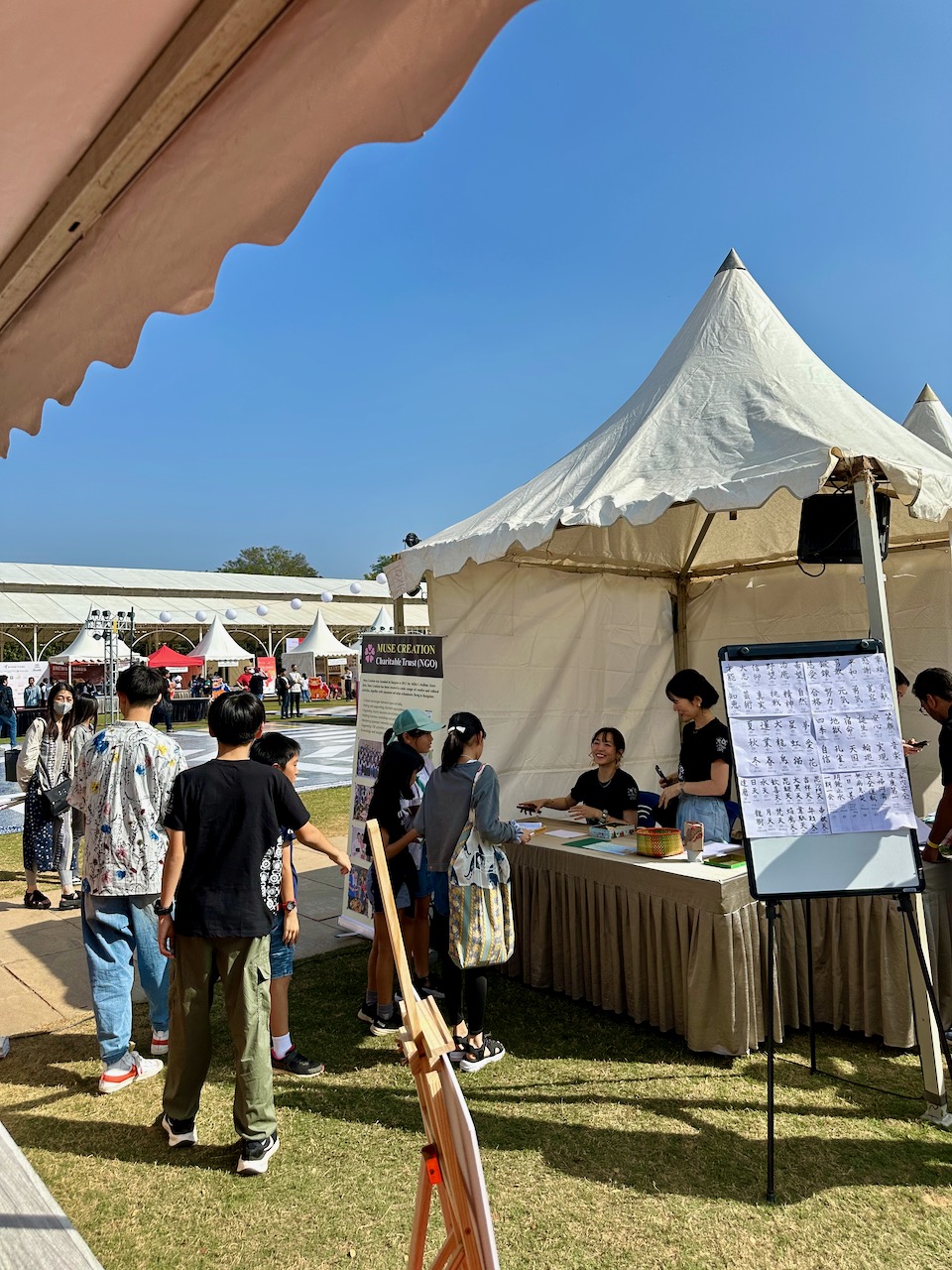 わたしが展示会に誘ったところ、彼女は先生にその旨を伝え、先生から訪問を打診された次第。もちろん歓迎だ。結果、40名(20名ずつの入れ替わり2部制)プラス先生2名がスクールバスでやってきた。完全に生きた授業状態である。ミューズ・クリエイションのメンバーやその友人各位もご来訪だったので、交流を図りつつ、ひととき楽しんでもらう。