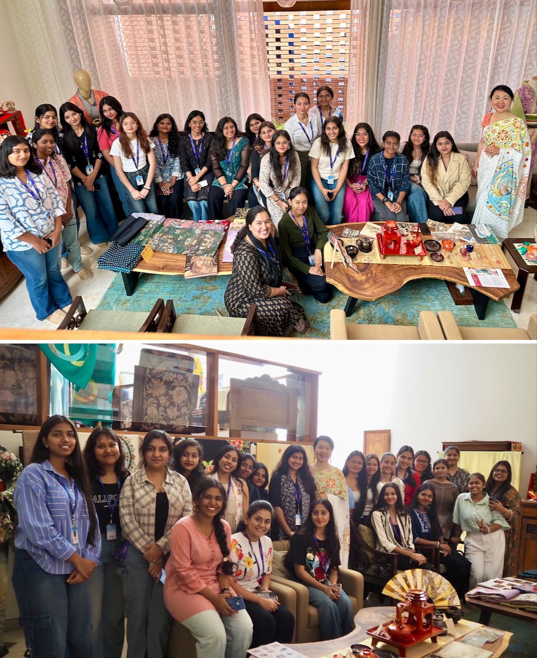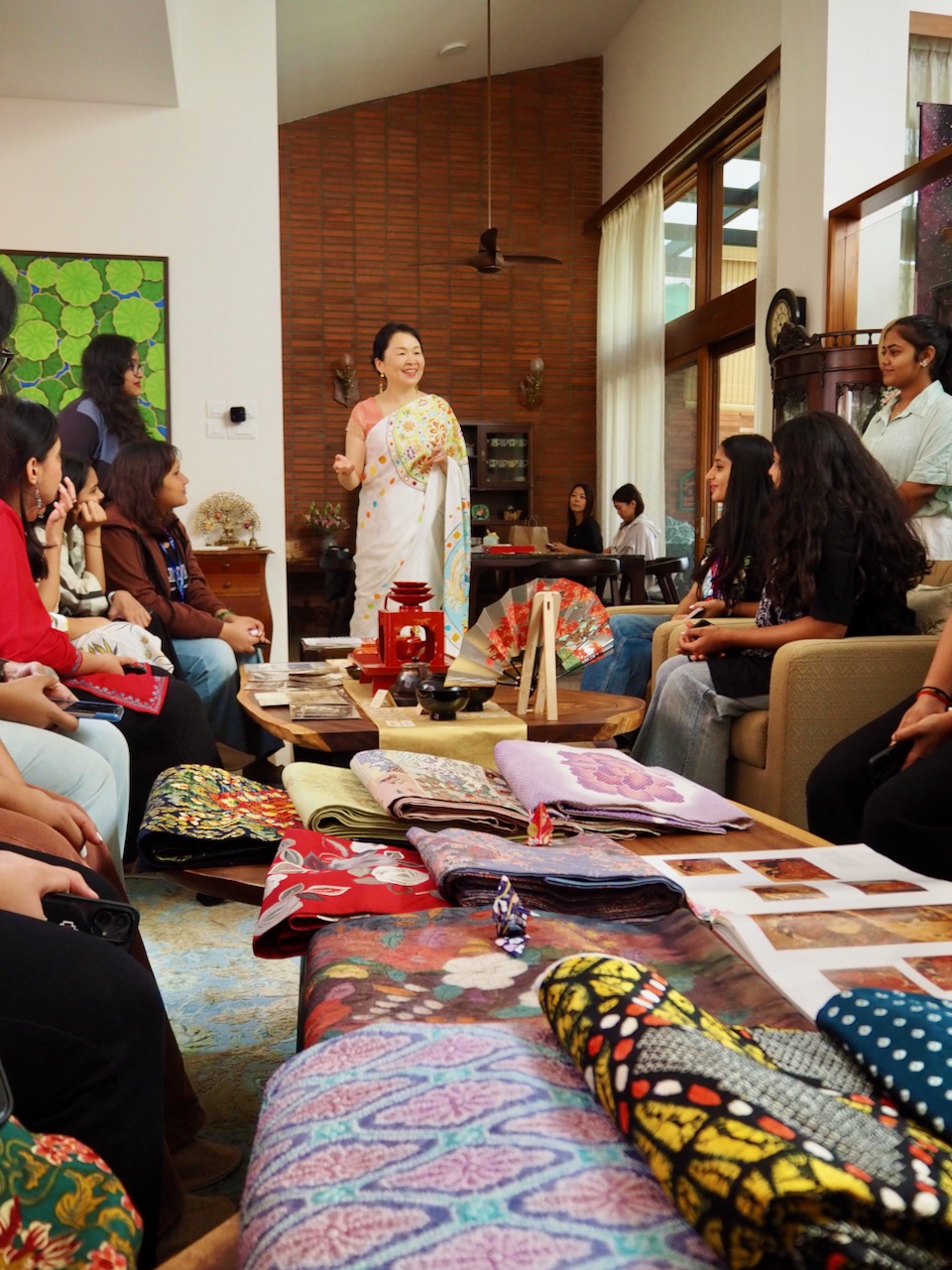 初日の昨日は、オープン早々、ファッションデザインスクール(The Army institute of fashion and design)の学生ら40名が来訪した。先日MAP (Museum of Art & Photography)で開催されたテキスタイルのシンポジウムを訪れた際、同校の学生が参加していたのだが、そのなかの一人が日本語を学んでいるということで、浴衣姿のわたしに声をかけてくれた。
