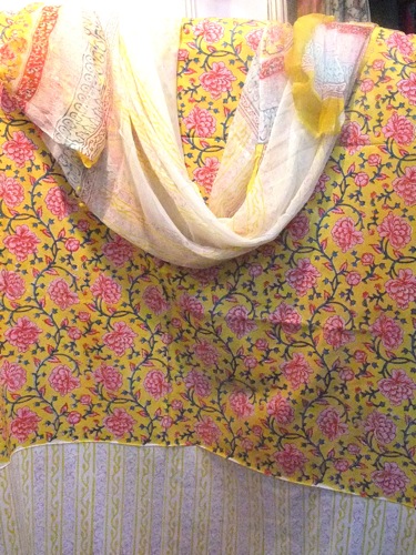 透け透けな織のシルク。金と赤のバラのような花がすてきです。一瞬、「けばすぎ?」な印象ですが、ここはインド。多少派手なくらい、ノープロブレム。これは買いです。